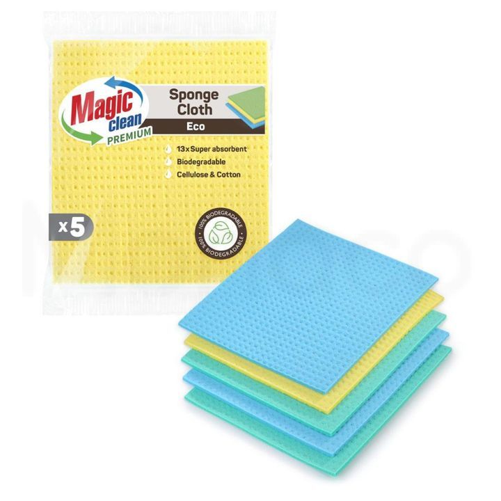 Попивателни кърпи биоразградими 5 бр. Изключително абсорбиращи - абсорбират 13 пъти собственото си тегло. Състав: регенерирана целулоза и памучна нишка. В процеса на обработка е използван мирабилит – сол от естествен минерал за повишаване на попивателната способност. Безвредни за природата. Сертифициран произход на продукта и документ за пълен разпад в природата без замърсявания за 85 дни. Подходящи за подсушаване и забърсване без употребата на препарат. Опаковка с еврохолдер.