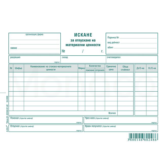 Искане за отпускане на материални ценности, 8 реда, химизирано, 100 листа